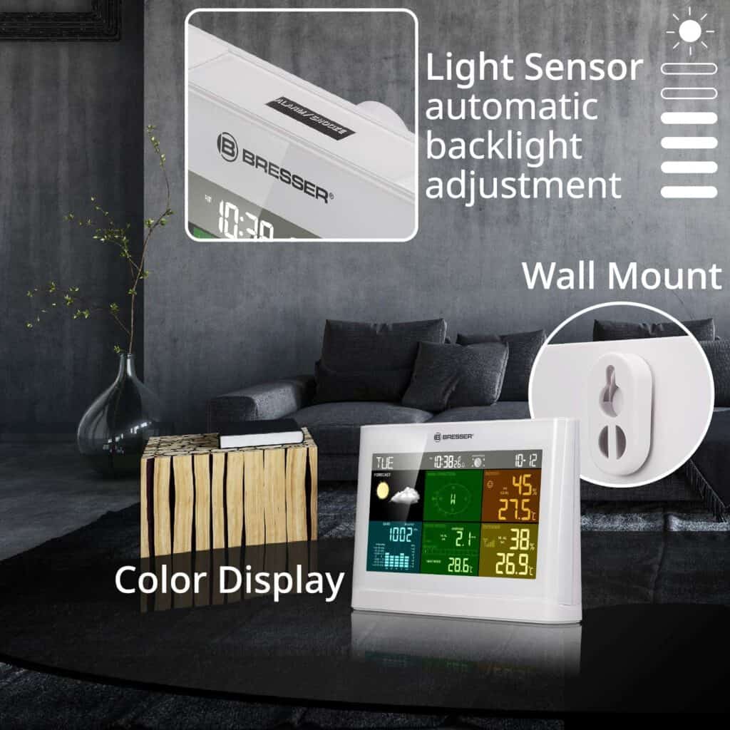 La estacion climatologica Bresser Comfort 5 en 1, combina una gran cantidad de información climática con una pantalla de gran tamaño. El caballito de batalla de este centro meteorológico radiocontrolado 5 en 1, es justamente su pantalla de nada menos que 7.3″, donde podemos ver toda la información separada en 6 zonas diferentes separadas por colores, otorgándole una absoluta claridad. La pantalla LCD, que permanece iluminada en todo momento conectada a la red eléctrica, cuenta con la opción de regular su intensidad, por medio del sensor de luz integrado.